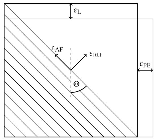 While putting pressure inside the PMA, the actuator gets shorter and expands. The deformation of the membrane is a plane state strain and can be described by the strain in direction of the PMA length and the PMA perimeter . Rotating the coordinate system by the membrane fiber angle , the deformation is given by the strain in fiber direction and the direction of pure rubber that is perpendicular to the fiber direction (see Figure 4). Following the approach of a constant fiber length, the strain is always zero. This means that the PMA membrane only expands perpendicularly to the fibers.