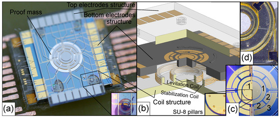 The suspension consists of three structures fabricated independently at the wafer scale, namely a coil structure and the upper and lower electrode structures. These were aligned and assembled into a sandwich by flip-chip bonding into one device with the dimensions: 9.2 × 9.2 × 1.74 , as shown in Figure 1. The coil structure consists of two coaxial 3D wire bonded micro-coils similar to those reported in our previous work [11], namely a stabilization and levitation coil, fabricated on a Pyrex substrate using SU-8 2150; see Figure 1b. For this particular device, a height of the coils is 600 , and the number of windings is 20 and 12 for the levitation and stabilization coil, respectively, which allow us to stably levitate an aluminum disk-shaped proof mass with a diameter of 3.2 and thickness of 30 at a levitation height of 150 . The bottom electrode structure was fabricated on an SOI wafer having a device layer of 40 , a buried oxide of 2 and a handling layer of 600 . The resistivity of the silicon layer is in the range of 1 to 30 . Furthermore, the device layer has a 500 oxide layer for passivation, on top of which electrodes are patterned by UV lithography of evaporated Cr/Au layers (20/150 ), as shown in the left part of Figure 1c. The SU-8 pillars cover the electrodes in order to insulate the proof mass and electrodes and reduce the contact area between the proof mass and the surface, where the proof mass is initially lying flat. The scaled up image at the left of Figure 1c shows the SU-8 pillar having a diameter of 50 and a height of 10 . After etching the handle layer up to the buried oxide by DRIE, the bottom electrode structure was aligned and bonded onto the coil structure, as shown in Figure 1d.
