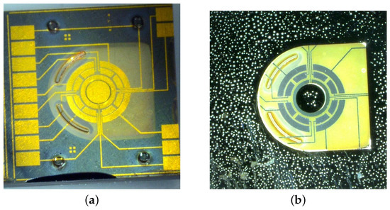 In order to avoid using an SOI wafer, and thus also to decrease the amount of parallel capacitance arising in the patterned electrodes due to the conductivity of Si, an alternative fabrication route for the bottom electrode structure was explored based on an intrinsically-doped Si wafer of 500 in thickness with a 1- oxide layer for passivation, as shown in Figure 2. On one side of the Si wafer, an SU-8 layer of 30 to 40 in thickness was fabricated by using the epoxy resist SU-8 3025. Then, the electrodes were patterned on this SU-8 layer by UV lithography as shown in Figure 2a. Instead of evaporation, the seed layers Cr/Au (20/150 nm) were sputtered on top of the SU-8 layer. Finally, etching the Si wafer through to the SU-8 layer by DRIE, a cavity for the micro-coils was fabricated as shown in Figure 2b.