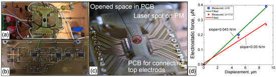 Coils were fed with a square wave AC current provided by a current amplifier (LCF A093R). The amplitude and frequency of the current in the coils was controlled by a function generator (Arbstudio 1104D) via a computer. A PCB for connecting the top electrodes was fabricated in such way as to leave clear the front of the levitation chip’s electrodes, so that a laser beam could reach the proof mass without obstruction, as shown in Figure 3c. This provided us with an additional means to control the linear displacement of the levitated proof mass using a laser distance sensor (LK-G32 with a resolution of 10 ) and a way to characterize the performance of the capacitive sensing circuit. By applying an electrostatic force generated by the electrodes “3” to the bottom surface of the proof mass, a plot of force against displacement was recorded. From the analysis of the plot, the effective suspension stiffness was estimated.