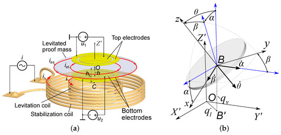 Schematic diagram for modeling the hybrid contactless suspension: (a) and are the potentials applied to the top and bottom electrodes, respectively; h is the space between an electrode’s plane and the equilibrium point of the proof mass; is the levitation height between the plane formed by the upper turn of the coils and the equilibrium point of the proof mass; and are the eddy currents corresponding to the maximum current density; (b) coordinate frames and generalized coordinates to define the position of the disc-shaped proof mass around the origin: , , and are the generalized coordinates corresponding to vertical, lateral and angular displacements, respectively.