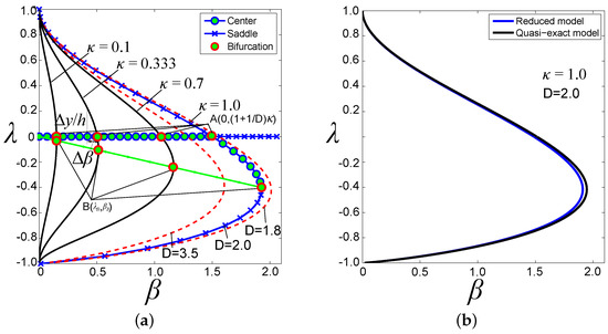 Bifurcation diagram: (a) dashed red lines show the evolution of the bifurcation map depending on constant D (); solid lines depict the evolution of the bifurcation map depending on spacing (); (b) comparison of the quasi-exact and reduced models for , and (the relative error is less than 2%).