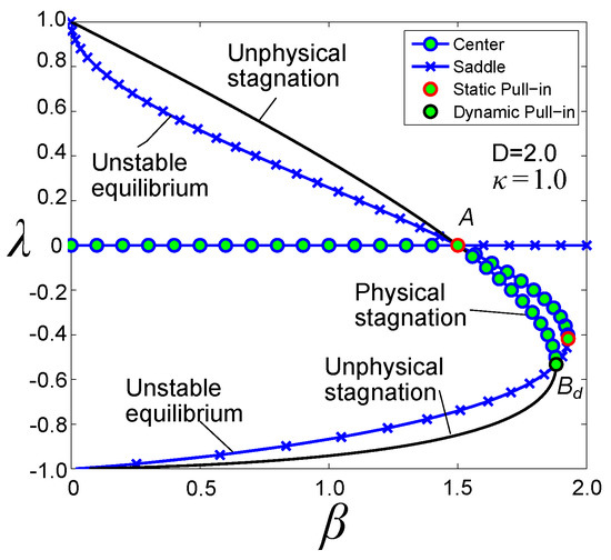 Using (19), the bifurcation diagram can be plotted as shown in Figure 6. Similar to the static bifurcation diagram, it has two pull-in instability points (see Figure 6). One point has the same coordinates as point A shown in (12) corresponding to the static pull-in instability, but has different coordinates compared to the static pull-in point B and can be found by numerically solving the following set: