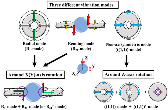 The operating principle of the sandwich-type MDOF-SUSM is shown in Figure 1. The motor’s annular stator can independently excite three different vibration modes: the bending vibration mode (B21-mode), the radial vibration mode (R1-mode), and the non-axisymmetric vibration mode (((1,1))-mode). The B21’-mode and ((1,1))’-mode are the same-shape orthogonal modes of the B21-mode and the ((1,1))-mode, respectively. A spherical rotor can be rotated around three axes by combining two of these vibration modes.