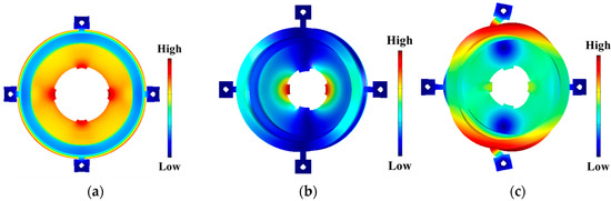 Strain distribution in the stator during each vibration mode. (a) R1-mode, (b) B21-mode, and (c) ((1,1))-mode. Animations of simulated vibration modes and an elliptical displacement motion are available as Supplement Materials.