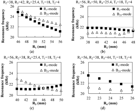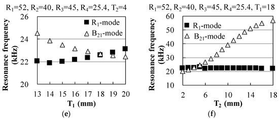 Simulated resonance frequency characteristics for the stator dimensional parameters identified in Figure 5. (a) R1; (b) R2; (c) R3; (d) R4; (e) T1; and (f) T2.