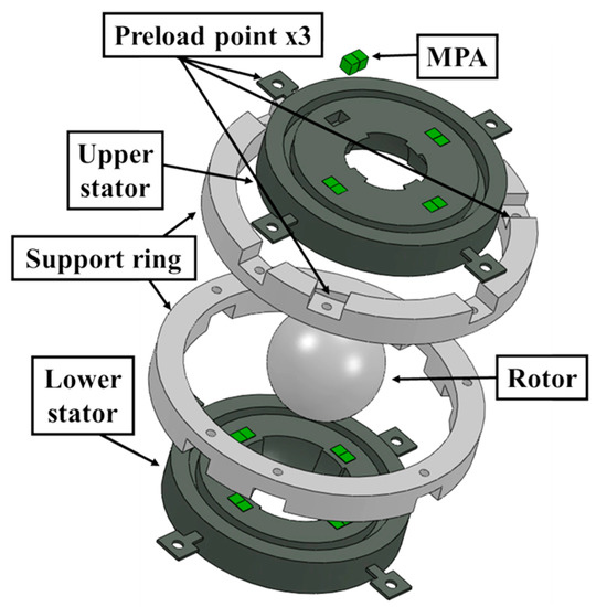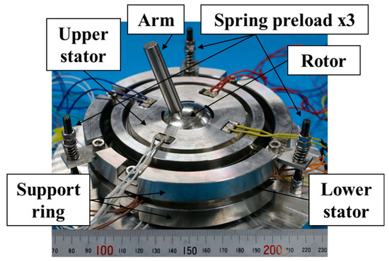 The authors previously reported MDOF-SUSMs using annular vibrating stators that can excite multiple vibration modes [28,29,30,31]. Our results showed that the sandwich-type MDOF-SUSM is effective for increasing torque despite its compact size [28,29]. The sandwich structure refers to a spherical rotor held between two annular vibrating stators. The MDOF motion of the rotor can be realized even if only one stator is used with a rotor support mechanism, so two active stators increases the torque for all three rotational axes. This simple structure has both a rotor support and a preload mechanism.