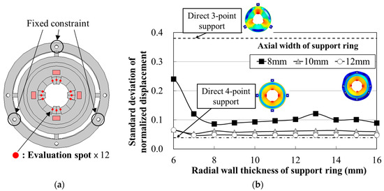 The basic construction of the new MDOF-SUSM design is shown in Figure 7. The stators, spherical rotor and support rings were made of the stainless steel SUS304. To achieve high torque with strong excitation, the structural stability of the preload mechanism is important. Supporting beams of the ϕ20 mm type stator shown in Figure 3 could reduce negative effects on the vibration mode. However, such a structure was weak against the force in the preload direction, so that large preload was hardly applied. Moreover, the ϕ20 mm type stator was apt to become unstable by its own output torque. Therefore, supporting beams of the prototype stator had relatively high rigidity in preload direction and radial direction. Each stator is fixed to a support ring at four points of supporting beams. The assembled support rings are used for preload adjustment. This construction aims to provide a uniform preload and its easy setting at three points without affecting the vibration modes. Hence, the support ring was designed by tuning its outer diameter, that is, its radial wall thickness and axial width, by FEA. The forced vibration of the stator was analyzed by FEA under the condition that the certain voltage of natural frequency of R1-mode was set to MPAs. The vibration amplitudes of R1-mode at 12 evaluation spots shown in Figure 8a were calculated about each dimension of support ring. If R1-mode was affected and deformed by the support ring, the evaluation spots at the inner circumference of the stator had different vibration amplitude. If not, the vibration amplitude at all evaluation spots should be almost the same. Negative effects on the vibration mode were evaluated by calculating the standard deviation (SD) which evaluates the degree of dispersion in vibration amplitude at the evaluation spots. The distribution of displacement is unaffected by the maximum vibration amplitude due to linear analysis, even though the maximum vibration amplitudes obtained in each simulation were different. Therefore, the SD of the simulated vibration amplitude normalized with its maximum value was suitable for the evaluation. The simulation results, shown in Figure 8b, confirmed that support ring effects on the vibration modes could be reduced by adjusting the radial wall thickness to 15 mm and the axial width to 12 mm. The SDs of 0.048 and 0.039 were obtained on the stator with and without the designed support ring, respectively. Thus, the stator support ring design considered the displacement deviation, given an approximation of the resonance frequencies of the vibration modes. The FEA results for stator resonance frequency were: 21.32 kHz for B21-mode, 21.41 kHz for R1-mode, and 24.30 kHz for ((1,1))-mode.