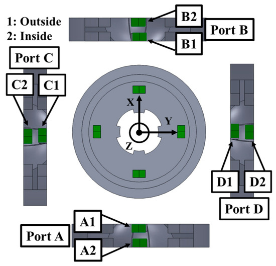 The arrangement of MPAs in the new stator is shown in Figure 9. Each vibration mode is excited by two ports on opposite sides of the stator: Port A and Port B, or Port C and Port D. The vibration mode can be selected by applying a sinusoidal voltage of the appropriate phase difference to each MPA, as shown in Table 1. Moreover, rotational movement in the three axis directions is generated by combining the two vibration modes that are excited in each port, as shown in Table 2.
