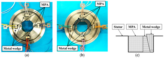 Photographs of stator used in the prototype MDOF-SUSM. (a) Outside view and (b) Inside view. (c) Structure of embedded MPA secured to the stator using metal wedges.