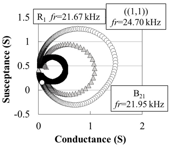 Figure 12 shows the admittance loops for each vibration mode of the prototype stator, as measured by an impedance analyzer. The resonance frequencies of each vibration mode were close to the results from FEA simulation. In the prototype, the dynamic admittances for B21-mode, R1-mode, and ((1,1))-mode were 1.08 S, 0.52 S, and 1.48 S, respectively. These values are very large, and a large current flow was expected. In addition, the resonance quality factors were obtained as 426 for B21-mode, 504 for R1-mode, and 301 for ((1,1))-mode. This confirmed that the prototype stator had good electrical performance despite its large and somewhat complicated structure.