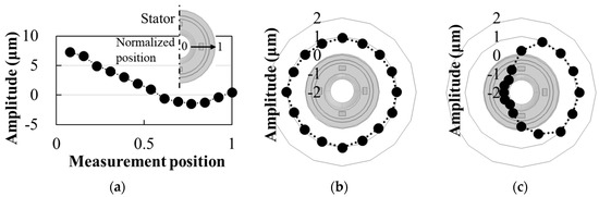 Vibration displacement measured on the prototype stator surface during each vibration mode. (a) B21-mode; (b) R1-mode; and (c) ((1,1))-mode.