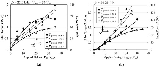 Maximum torque and electric input power with respect to applied voltage. (a) Rotation around X(Y)-axis and (b) Rotation around Z-axis.