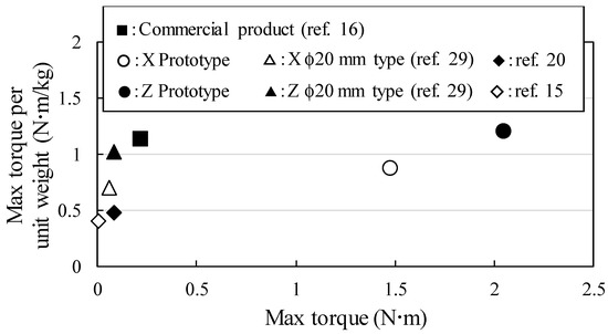 Figure 16 compares the maximum torques and torques per unit weight for various MDOF-SUSMs previously reported [15,16,20,29]. The maximum torque obtained by the new design was much larger than those obtained by other motors. The targeted maximum torque of 10 N∙m, suitable for high-load applications like shoulder joints, was not achieved, but the torque per unit weight increased and the maximum torque was about 5 to 7 times greater as compared to the other MDOF-SUSMs having high maximum torques, as shown in Figure 16. The most of MDOF-SUSMs for the comparison have not used a friction material. Especially, ϕ20 mm type which was previous type with the similar structure did not use a friction material. If a friction material was used, the maximum torque would decrease. The friction condition was severe, but was set as a comparison condition.