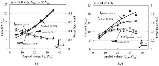 Figure 17a,b show the measured effective values for current and power factor corresponding to the applied voltage shown in Figure 15, respectively. The prototype needed to be driven with large input power and high current, as shown in Figure 15 and Figure 17, because of the large capacitance of the MPAs, which made the power factor low (Figure 15). As a result, the maximum output current of the amplifiers (BP4610, NF Co., Yokohama, Japan) was reached before the full potential torque performance of the prototype motor was attained. Hence, the measured maximum torques were limited by the ability of the amplifiers to supply current. If the driving current supply were larger, a larger maximum torque and torque per unit weight could be obtained. Therefore, future studies will explore the improvement of the power factor for the driving circuit.