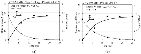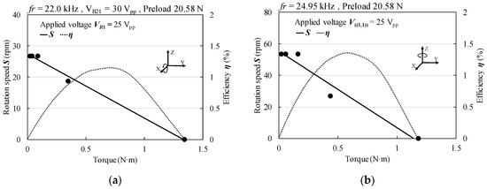 Figure 18a–d shows the transient response of the X-axis and Z-axis rotation speeds for preloads of 11.76 N and 20.58 N, as measured with a high-speed digital camera (1200 fps). The rise time was calculated using the rise curve of the rotation speed estimated by fitting each measured point. The estimated rise times were about 4 ms to 8 ms. The load characteristics were simulated by the moment of inertia of the rotor, the rise curve, and the calculated rise time [32]. Figure 19a–d shows the simulated load characteristics of X-axis and Z-axis rotations for preloads of 11.76 N and 20.58 N. The speed-load curves were derived from the gradient of the rise curve. The efficiency-load curves were estimated from the mechanical output and the electrical input power shown in Figure 15. The maximum torque almost agreed with the measured value shown in Figure 13. Maximum efficiencies of about 0.2% to 1.4% were obtained. The causes of the low efficiency were likely the high current flow and low power factor, as well as friction loss between the rotor and stator. Moreover, the MPAs, which were made of hard piezoelectric material provided with high mechanical quality factor, had large heat loss when driven at high frequency. Therefore, the first step for improving the efficiency will be to provide a power factor improvement circuit.