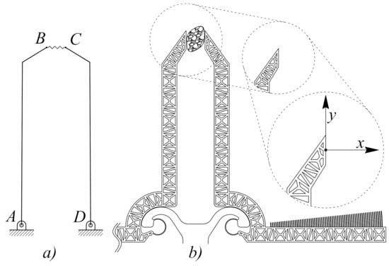 Two different types of microgrippers were designed and tested in this study, both realized by means of bulk microelectromechanical systems (MEMS) technology using silicon on insulator wafer substrates and deep reactive ion etching [13]. The design of the first prototype was developed using a scheme with two degrees of freedom and was inspired by the simplest rotating jaw system, as schematically reported in Figure 1. The PRBM, reported in Figure 1a), corresponds to the compliant structure illustrated in Figure 1b), where two flexure hinges have been introduced in place of the ordinary revolute pairs in A and D. In the figure, the reference system has also been introduced to monitor the motion of the jaw tip point. By using revolute joint-to-flexure substitution, any PRBM (Figure 1a) can be of inspiration to obtain an original compliant structure (Figure 1b). In the case under study, the left- and right-hand side jaws correspond to the rigid links and (of the ordinary linkage), which rotate around the fixed points A and D, respectively. When a tissue is grasped by the jaws ( in Figure 1), the overall scheme looks like a four-bar linkage whose coupler represents an elastic medium.