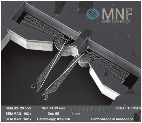 Scanning Electron Microscope (SEM) image of the first microgripper prototype, developed with the simple structure two joint-2 jaws and with two degrees of freedom (white solid lines and correspond to rigid links, which rotate around the fixed points A and D, respectively).