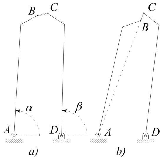 Considering the viscous behavior of the tissues, however, these microgripper designs, because of their simple structure and of the tissue compliance, can reach some critical configurations. This situation is shown in Figure 3a, where the link , representing the visco-elastic tissue, is not rigid anymore and could give rise to the critical configuration depicted in Figure 3b, where the points A, B and C are aligned. From this pose, any arbitrary rotation of link can not define a unique rotation because the link could be either rotated clockwise or counterclockwise. In this case, a more complicated control strategy should be applied and therefore a more complicated Application Specific Integrated Circuit (ASIC) is required.