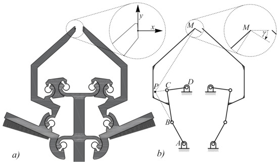 Planar layout (a) and functional scheme, PRBM model (b), of the second generation microgrippers with a pair of four-bar linkages , each one having four CSFHs and tip M attached to the coupler link . Point P represents the instantaneous rotation center for the coupler .