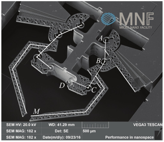 The functional design of the two symmetric four-bar linkages is illustrated in Figure 4b, where the coupler sustains the motion of the coupler point M. A prototype of such microdevice (Figure 5) was fabricated and tested. For clarity, the SEM image presented in Figure 5 also shows lines representing the pair of four-bar linkage and the coupler point M.