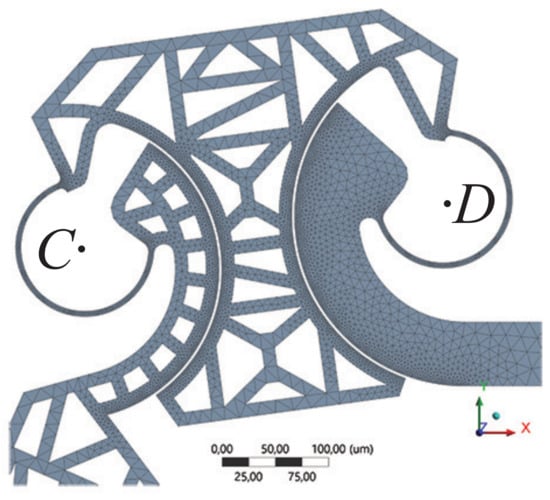 Detail of the refined mesh in two flexures, corresponding to the four-bars microgripper. Letters C and D refer to the same letters and structures presented in Figure 5.