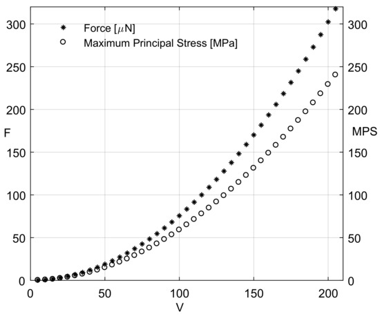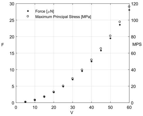 For the first prototype, i.e., the one-link microgripper (Figure 2), the generated mesh was composed of 14,401 nodes and 10,563 elements. The maximum angular stroke (4.0°) was reported at the force f = 28 N, corresponding to an applied voltage of 60 V. Figure 7 reports, with respect to the applied electric potential difference, the values of the force exerted by each comb drive and the maximum values of the maximum principal stress (MPS) distribution, determined by means of Equation (1) and FEA, respectively. The maximum value of the MPS is equal to 116 MPa, i.e., below the yield strength of a single-crystal silicon [30]. The path followed by the microgripper tip is depicted in Figure 8. The displacement corresponding to the last simulation step is equal to 103.5 m along the x-axis and to 17.7 m along the y-axis.