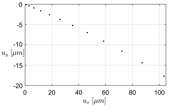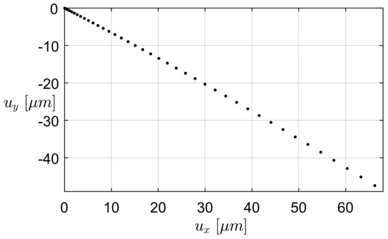 The path followed by the microgripper tip is depicted in Figure 10. The displacement corresponding to the last simulation step is equal to 66.2 m along the x-axis and to 47.4 m along the y-axis. The simulation of the tip path is particularly important in the case of the four-bar linkage. Considering Figure 4b, the angle of inclination of the tangent of the path of the tip point M, in the undeformed configuration, could be easily measured, as evident from the PRBM four-bar linkage. As is already known, angle is coincident with the inclination angle of the velocity of point M. Therefore, once the center P is identified of instantaneous rotation of the coupler (as made evident in Figure 4b), , and thus the path tangent in M, must be orthogonal to the line PM. While geometry of the PRBM yields a value of , Figure 10 shows that the simulated path is tangent to an inclination varying from (at the undeformed initial configuration) to (at the limit position), with a negligible discrepancy both at the beginning and at the extreme position of the path. The two analyses performed for the simulation of microgripper behaviour, i.e., PRBM and FEA, are therefore in good agreement and lead to the conclusion that the method based on the analysis of the PRBM can be successfully employed to design new gripper layouts. This allows designers to conceive new microgrippers that could successfully be employed as biomedical tools for tissue manipulation or for minimally invasive surgery.