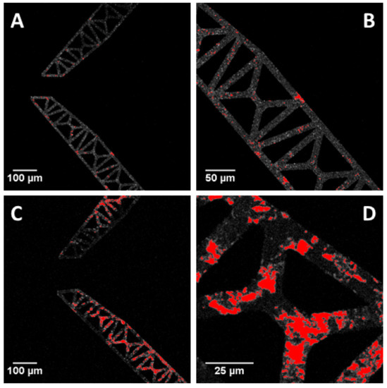 Images of BSA-TAMRA (red regions) adsorbed on the aluminum side of microgrippers (A and B) or on the silicon side of microgrippers (C and D), presented with different magnifications. BSA was incubated for 30 min at 0.2 mg/mL, at room temperature. Microgrippers are highlighted in gray.