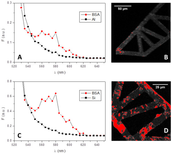 The same behaviour was observed also after 5 h of BSA incubation, i.e., albumin adsorption was more evident on the silicon side than on the aluminum side (Figure 12, panels B and D). Moreover, the signal acquired on both surfaces was checked for its specificity by measuring the fluorescence spectra on different areas of the images. A clear fluorescence peak corresponding to the maximum emission wavelength of TAMRA (i.e., 580 nm) was always detected from the data corresponding to the red areas (circles in panels A and C of Figure 12), confirming the adsorption of albumin. This conclusion was reinforced by the spectral data taken on the gray areas of the microgrippers (squares in panels A and C of Figure 12), which did not present any specific peak in the fluorescence spectra.
