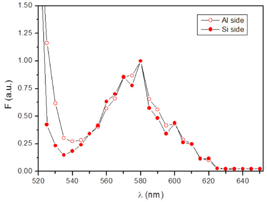 Fluorescence emission spectra measured either on the aluminum side (open circles) or on the silicon side (solid circles) of microgrippers. Spectra were taken on microgrippers treated for 64 h with 0.2 mg/mL BSA-TAMRA at room temperature. Fluorescence intensities are normalized to the maximum wavelength, i.e., 580 nm.