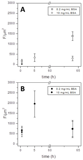 BSA-TAMRA adsorption on the aluminum side (A) and the silicon side (B) of microgrippers. Adsorption is shown as fluorescence intensity per area unit. Two different concentrations of BSA were incubated, i.e., 0.2 mg/mL (squares) and 10 mg /mL (circles), for 30 min, 5 h or 64 h at room temperature.