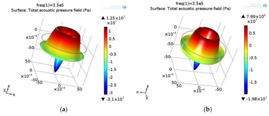 The Comsol Multiphysics software platform (Comsol, Inc., Burlington, MA, USA) was used for simulating the physics-based pressure acoustics problem in the frequency domain. The boundary of the acoustic fluid pressure domain was excited by normal acceleration of a piezoelectric actuator cylinder element. The pressure field of the standing wave in the section of the piezoceramic tube-shaped actuator perpendicular to its axis is shown in Figure 2. This 3D image is tied to the acoustic pressure distribution according to the scale given in the color palette column.