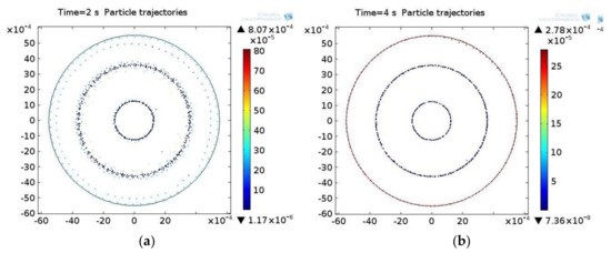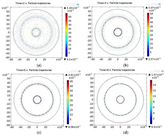 The next step is to solve the equation of particle motion in the acoustic field, where the solution determines the position of the particles in the field at the moment of time ti. At the initial time t0, the particles are uniformly distributed in the acoustic field. Under excitation of the actuator, the ultrasonic standing wave begins to move and concentrate in those areas of the acoustic pressure field where the sound pressure is the smallest. The distribution of the particles in the acoustic field at different points in time is shown in Figure 4 for the biological suspension. The color of the particles represents the speed at the moment of time ti, which is calculated by integrating the equations of motion.