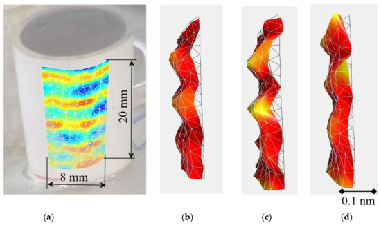 Photo of the tube-shaped prototype actuator and a segment of its surface (a), which is 3D-scanned to determine vibrating deflection shapes and eigenmodes of the actuator (b–d).