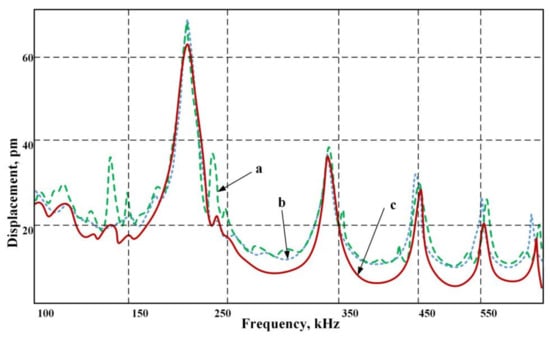 A stable resonance frequency of 345 kHz allowed us to obtain a constant suspension flow separated into fractions. At a frequency of 202 kHz, the amplitude of deformation is the greatest, but the study showed flow instability that led to the suspension mixing rather than its separation. Therefore, we had to give up the greater amplitude in order to continually collect particles and move them to the desired trajectory of the ultrasonic signal. Here, (a) denotes the deformation in the fluid without suspension, (b) stands for a signal for a water suspension and (c) describes the operation when using a biological suspension-viscous fluid. As can be seen from the chart, with a viscous flow, there is a certain quenching strain on non-resonant frequencies.