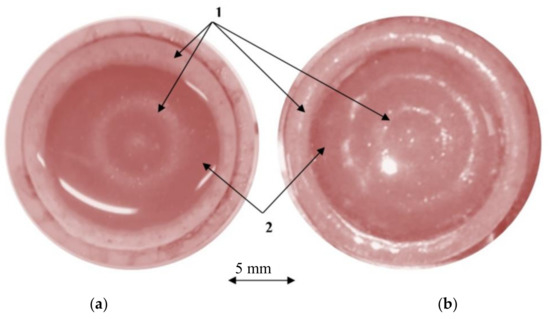 The distribution of the particles in the cylinder with the suspension under the influence of a standing ultrasonic wave: (a) excitation frequency of 202 kHz; (b) excitation frequency of 345 kHz; the microparticles distribution in standing wave nodal (1) and anti-nodal (2) circles.
