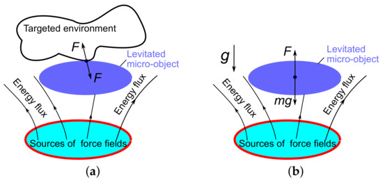 Levitating micro-actuators are those for which the force, applied to a targeted environment, is the result of a change in stored electromagnetic energy in force fields, which in turn induces ponderomotive forces acting on a micro-object (proof mass) in proximity to this environment (Figure 1). Thus, levitating micro-actuators consist of two primary elements, namely, a set of sources of force fields, and a micro-object (proof mass or acting object) which is stably levitated by these fields with the intention to act on the targeted environment, see Figure 1a. The levitation of a micro-object itself, without contacting the targeted environment, is considered actuation as well, since it provides, for instance, compensation of the gravitational force or other external forces acting on a levitated micro-object and changing its equilibrium state, as shown in Figure 1b.