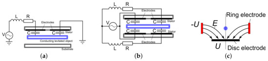 In 1990, the electric levitation micro-actuator (ELMA) based on passive levitation was proposed by Kumar et al. as a solution of the friction problem in MEMS actuators [19]. Using a tuned inductance, capacitance, resistance (LCR) circuit, necessary conditions for open-loop stable levitation of a micro-disc and its dynamics were analyzed. The authors analyzed two designs having a single and dual stator (see Figure 2a,b) and considered their potential application in micro-motors and bearings. Then, in 1992, the single-stator design for an application as micro-bearing was successfully experimentally studied by levitating a micro-plate having a thickness of 180 [21]. The actuator was able to generate a force up to 0.2 along the vertical axis. Then, using a similar single-stator design of ELMA as shown in Figure 2a, but with an active approach for levitation, Higuchi’s group from the University of Tokyo electrically suspended an aluminium disk [22] and a glass plate [23]. Later, adding a variable-capacitance actuation principle to the actuator based on this single stator design, the same group suspended and linearly transported a silicon wafer [24], and demonstrated a motor in which a rotor was revolved with a speed of 60 by applying a rotational torque of 8.6 [25].