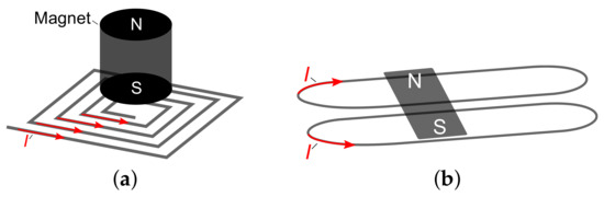 Magnetic levitation micro-actuators (I is the electric direct current (DC)): (a) square coil design for micro-assembly [42]; (b) set of coils for a linear actuator [44].