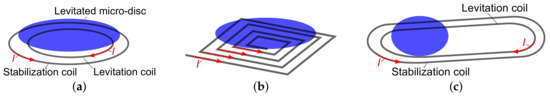 Inductive levitation micro-actuators: (a) two coils design, I is the electric alternate current (AC) [47]; (b) spiral coil design [52]; (c) two racetrack-shaped solenoidal 3D wire-bonded micro-coils [17].