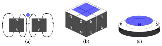 Diamagnetic levitation micro-actuators: (a) two magnet design for levitation of droplet/particle [61,62,65,66]; (b) four magnet design for levitation of a plate [67,68]; (c) the design with a ring and disc shaped magnets [69,70].
