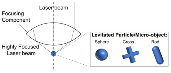 Schematic of a highly focused laser beam to create an optical trap and levitate particles or micro-objects. Particles or micro-objects of arbitrary shape (sphere, cross and rod) can be trapped in an optical trap.