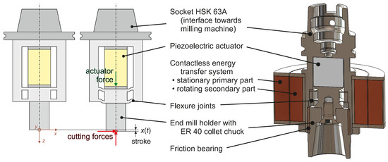 It is well known that piezoelectric transducers are not capable of sustaining shear stress. Since the milling process comes along with lateral cutting forces, a mechanical structure is needed that is soft in axial direction, where vibration is desired, but stiff in lateral direction. A specially designed flexure joint has been introduced for that reason. In addition, it is used for prestressing the actuator. For very high lateral forces, a friction bearing has been inserted to prevent damage of the system.