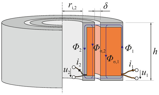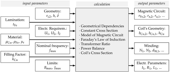 14]. The proposed concept incorporates the effects of leakage flux and eddy currents. The required input parameters and the calculated output parameters are sketched in