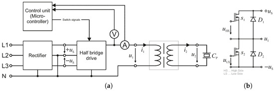 active switching phase: Either switch or switch are closed. During this phase, the half bridge output voltage is roughly one of the supply voltages, . The according transistor is turned on, and the absolute value of the primary current is rising. The length of this time interval is determined by the control unit.