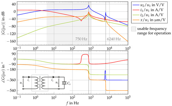 Table A2. One can easily see that there are two resonance frequencies. The first one is the electrical eigenfrequency of the secondary part’s inductance and the piezo capacitance. The second one is the mechanical eigenfrequency resulting from mass and stiffness. Both eigenfrequencies are a result of the design process and can therefore not be shifted to a desired value as long as all the input variables shown in