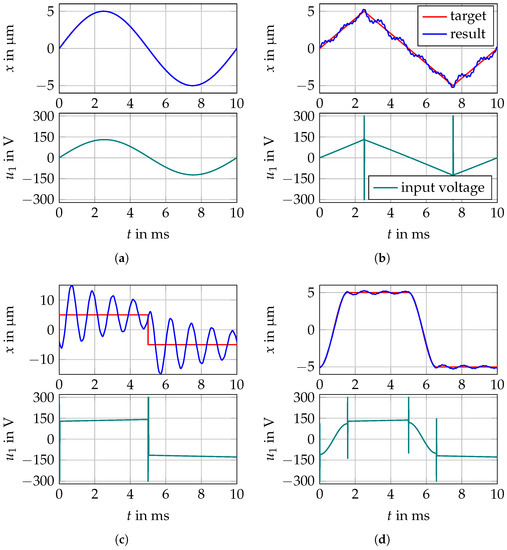 Figure 9, some limitations of this approach can be deduced. Steps or other discontinuities result in infinite impulses in the excitation voltage signal. Since, in this simulation, the voltage has been limited to the finite supply voltage, there is a huge deviation between target and resulting signal, as can be seen in