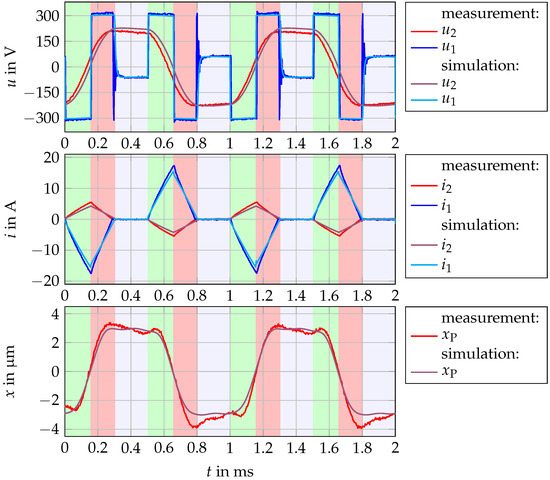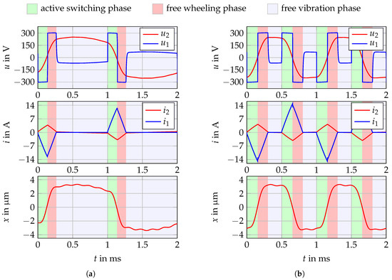 free vibration phase: Both switches are open. During this last phase, the primary current is zero. Since voltage and current in the secondary part of the transformer are not necessarily zero, there is an induced voltage at the half bridge’s output, , which can be measured for controlling the turn-on time. In theory, it is possible that the induced voltage could exceed one of the supply voltages. In this case, again, free wheeling would occur. Without significant load forces acting on the piezoelectric actuator, this can never happen. This sequence repeats itself, alternatingly switching and .
