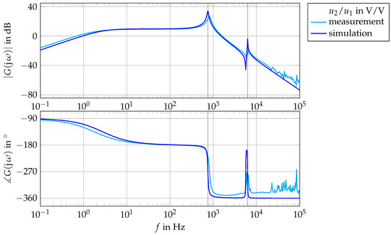 It can be clearly seen that the two functions fit well qualitatively, but there are deviations in distinct characteristics like resonant frequencies, damping factors and the cut-off frequency. Since there are tolerances when building up test setups and the simulated data has not been fitted to the measurements, this deviation is acceptable.